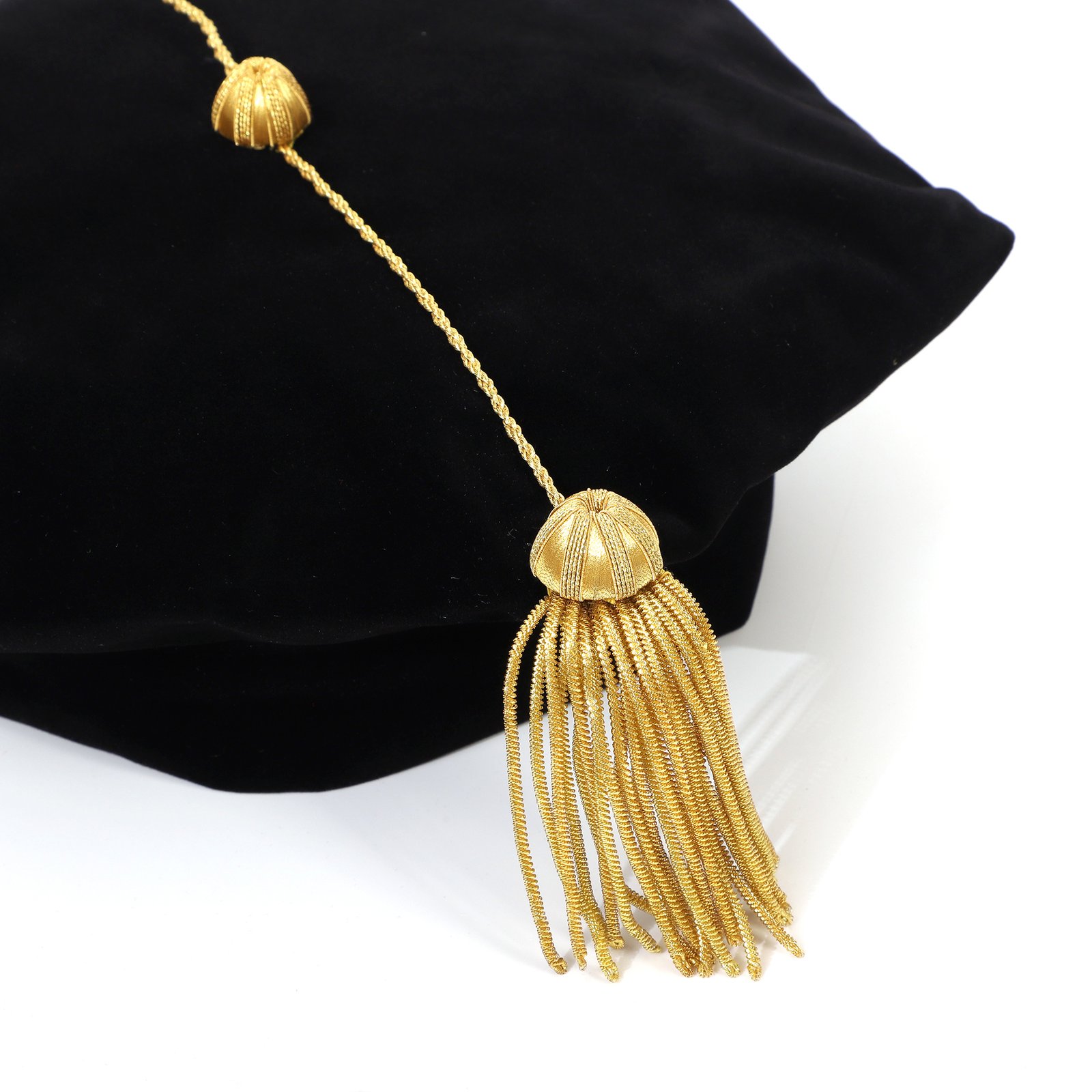 Design: The doctoral graduation tam is made of velvet and adorned with exquisite gold bullion tassel, which is secured to the left. The tam holds its shape very well. The points were pronounced, and the sides not flopped down. Velcro is firmly adhered and not easily detached. This design not only increases the aesthetics of the cap, but also gives it a unique academic significance