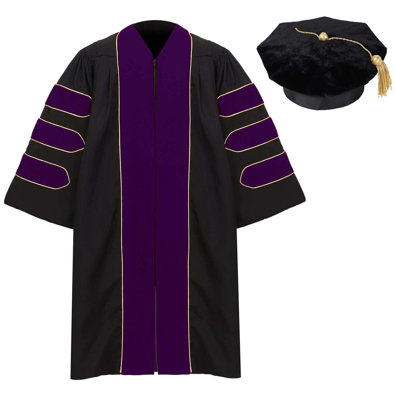 - Design: The unisex doctoral graduation gown is meticulously adorned with fine shirred detail along the shoulders and yoke, the gold piping on shoulder, and three velvet bars on each gathered bell sleeve and wide velvet panels on the front. Hidden zipper closure with hook eye clasp. Designed with a relaxed, flowy silhouette to allow freedom of movement during ceremonies. The doctoral graduation tam is made of velvet and adorned with exquisite gold bullion tassel