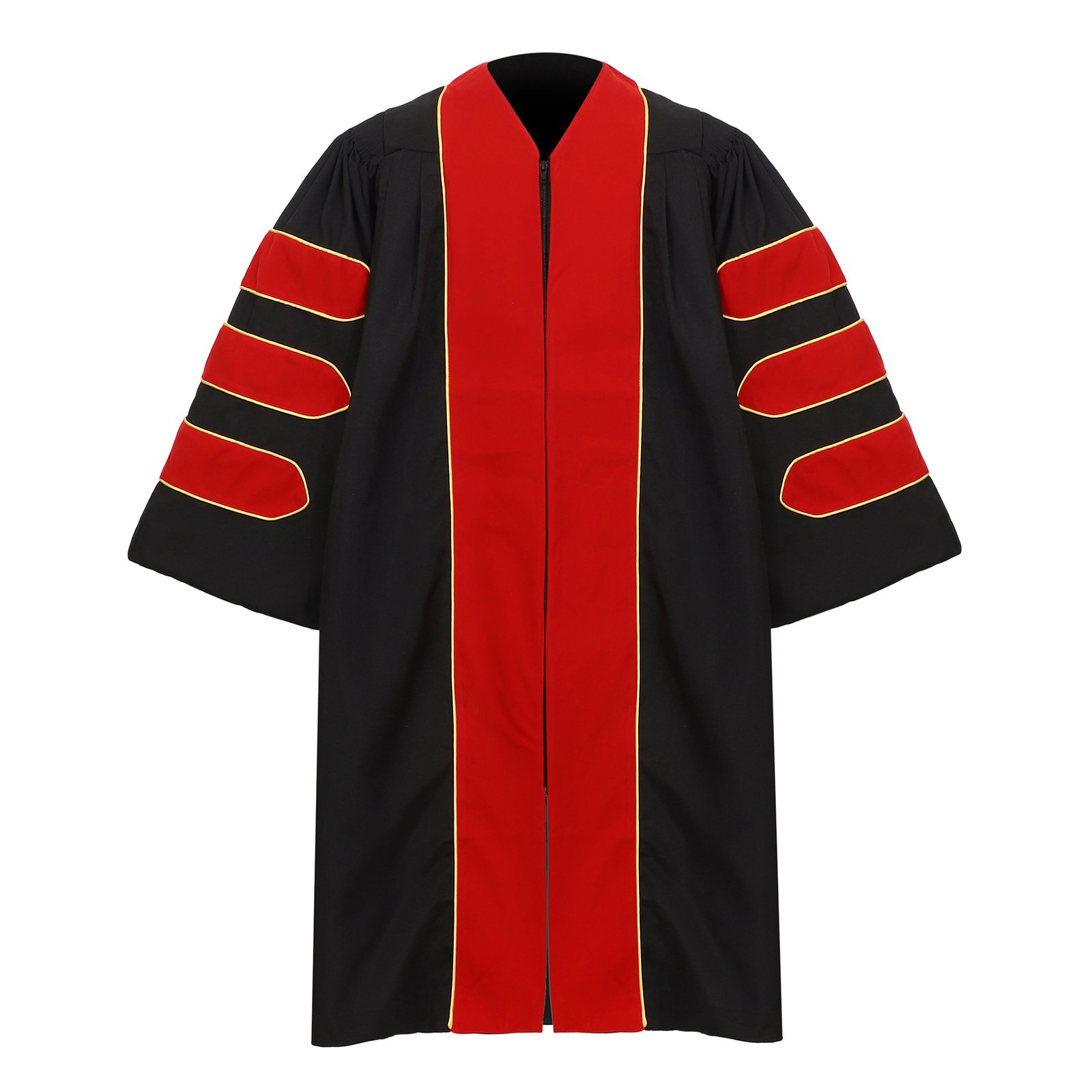 - Design: The unisex doctoral graduation gown is meticulously adorned with fine shirred detail along the shoulders and yoke, the gold piping on shoulder, and three velvet bars on each gathered bell sleeve and wide velvet panels on the front. Hidden zipper closure with hook eye clasp. Everything is reinforced sewed and the inside collar is lined which support a clean look. Designed with a relaxed, flowy silhouette to allow freedom of movement during ceremonies